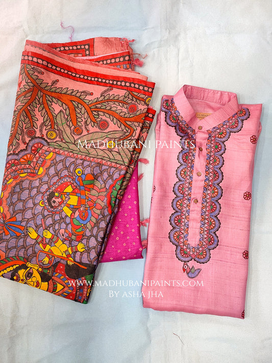 Laal Mithila Kamal Matsya Leela Men's Tussar Silk Kurta Pant Paag Dopptta Set