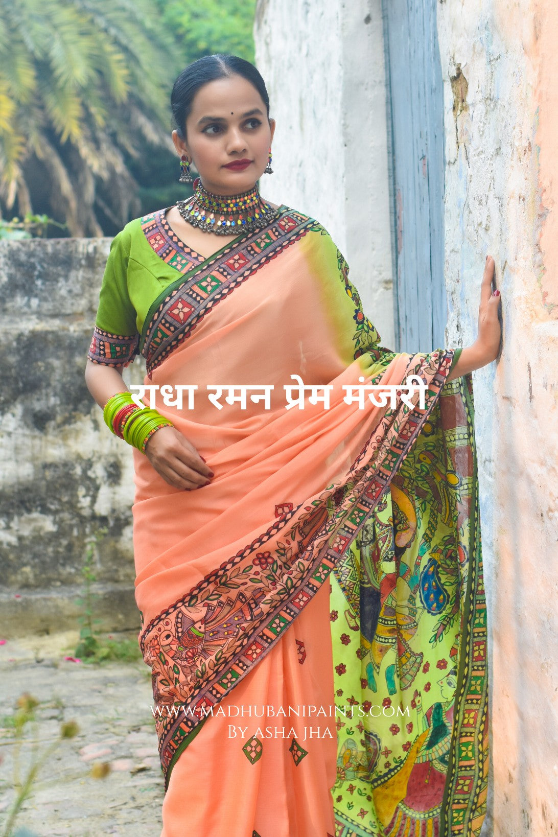 Radha Raman Prem Manjari Hand-painted Madhubani Chiffon Saree