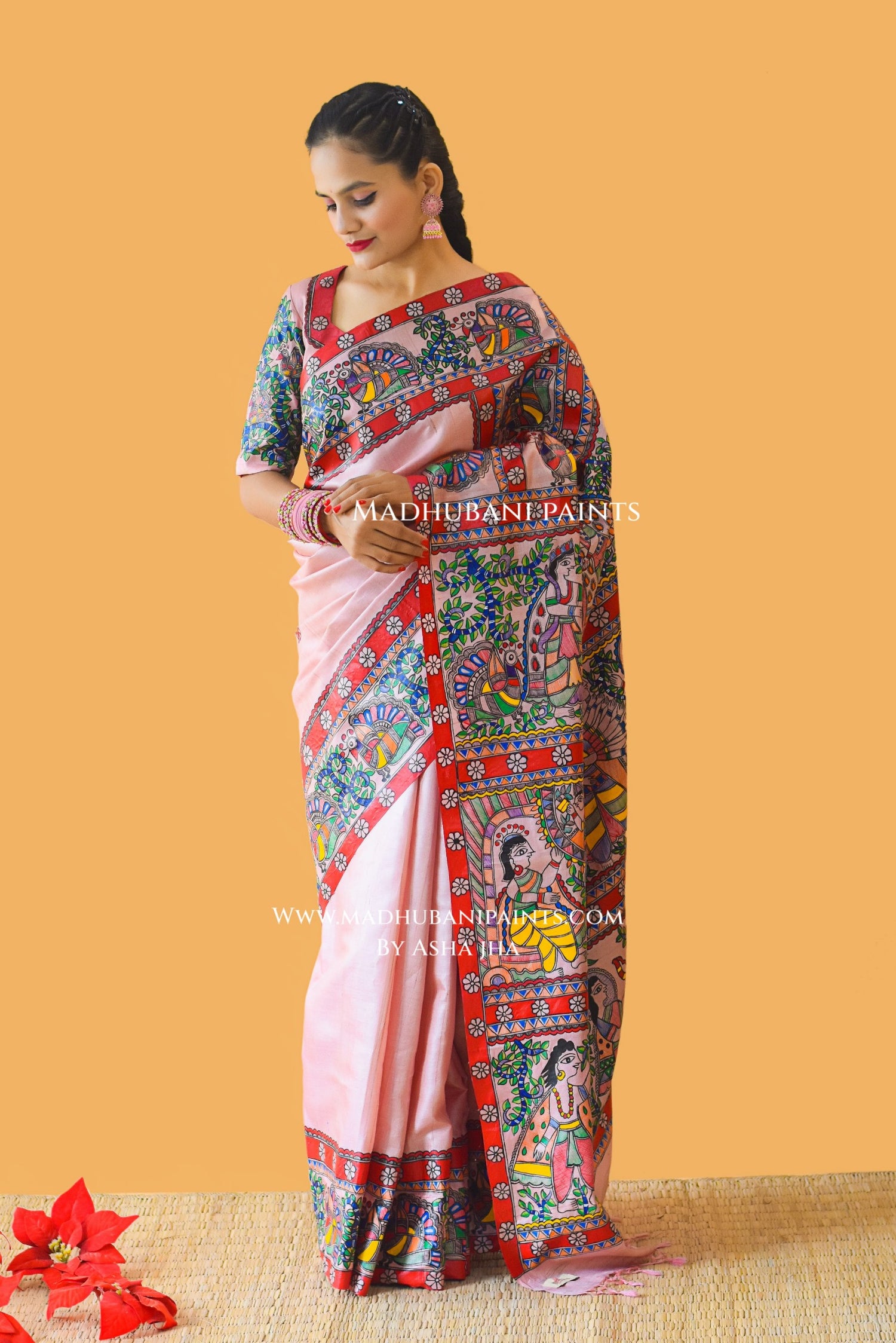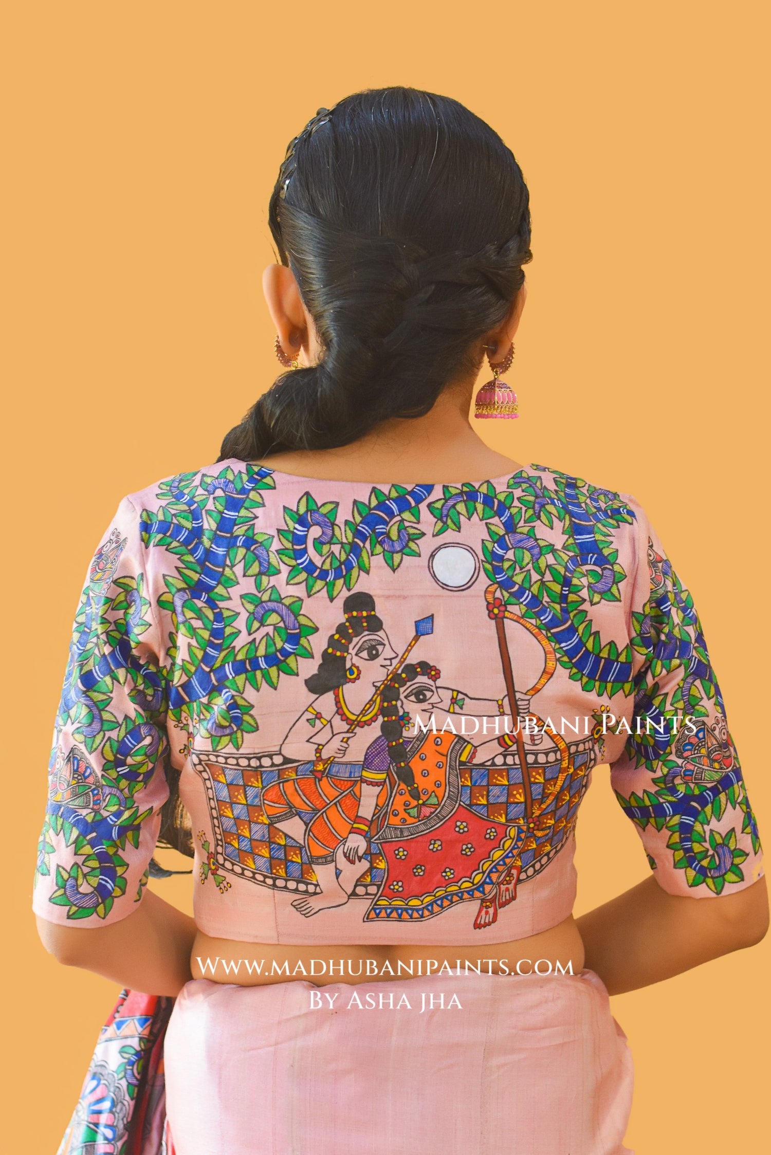 "RAMAYAN STUTI" Hand-painted Madhubani Tussar Silk Saree Blouse Set