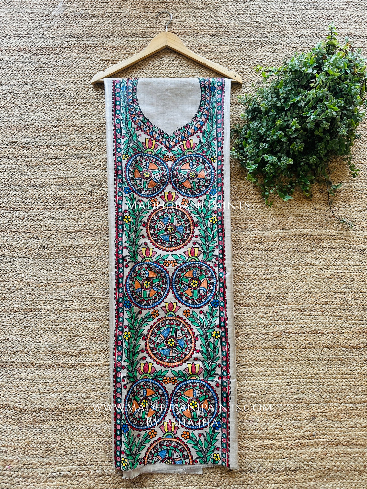 This Kurta is painted in multi color with depiction of beautiful artwork of fish and floral artwork on the front panel
