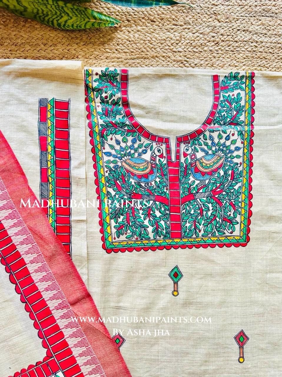 Laal Mayuri Hand-painted Madhubani Painting Cotton Unstitched Kurta Pant Dupatta Set