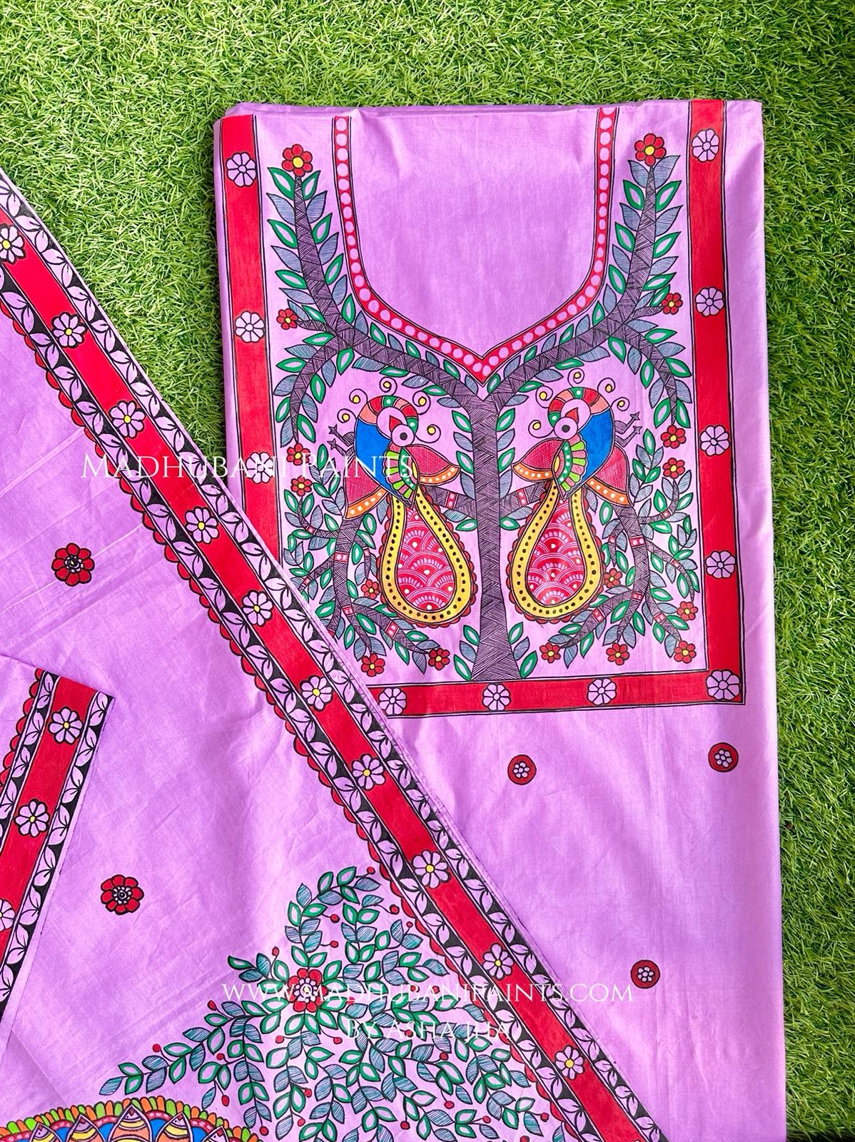 Lilac Judwa Mayuri Hand-painted Madhubani Painting Cotton Unstitched Kurta Pant Dupatta Set