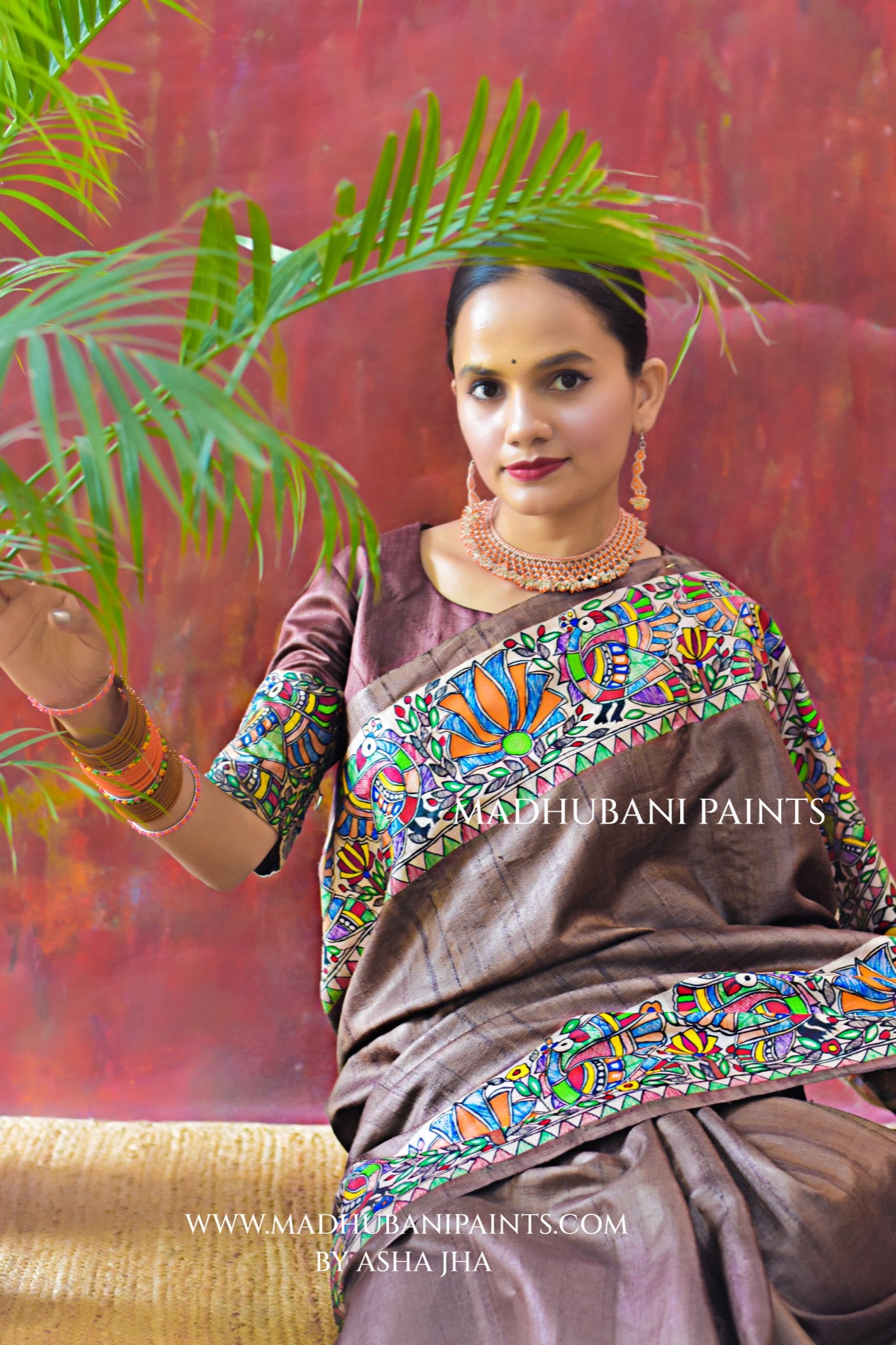 RADHA KRISHNA VRINDAVAN Hand-painted Madhubani Tussar Silk Saree