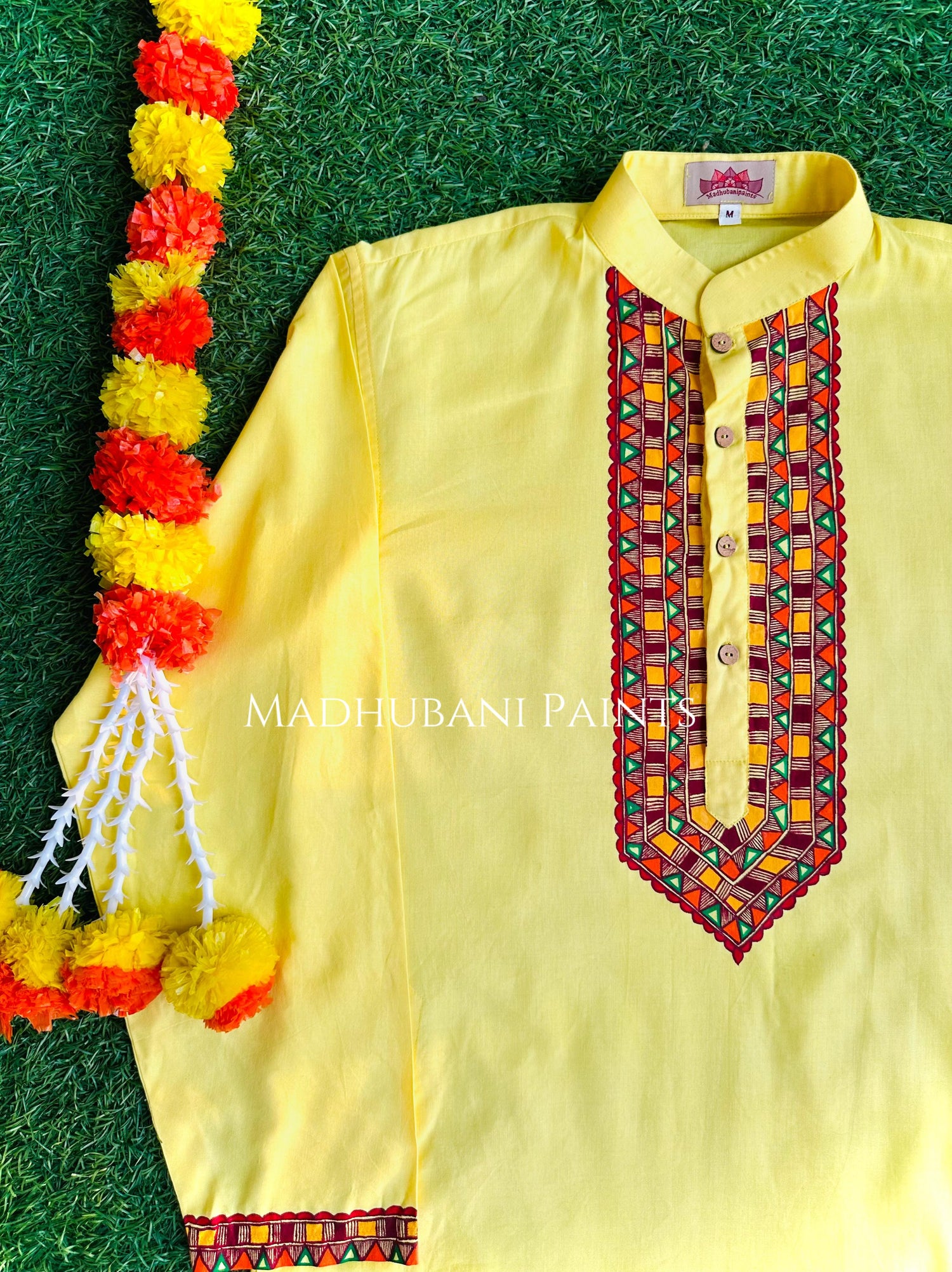 Yellow Chhath Puja Hand-painted Madhubani Men's Cotton Kurta